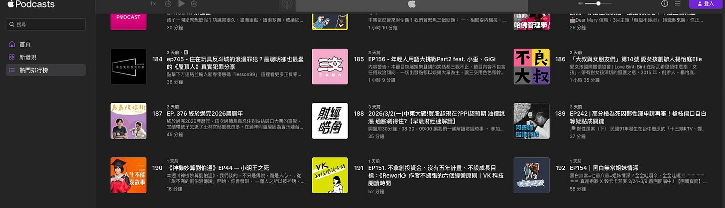 上週心血來潮點開了 Apple Podcast 的熱門單集排行榜,結果竟然看到最新一集在上面。